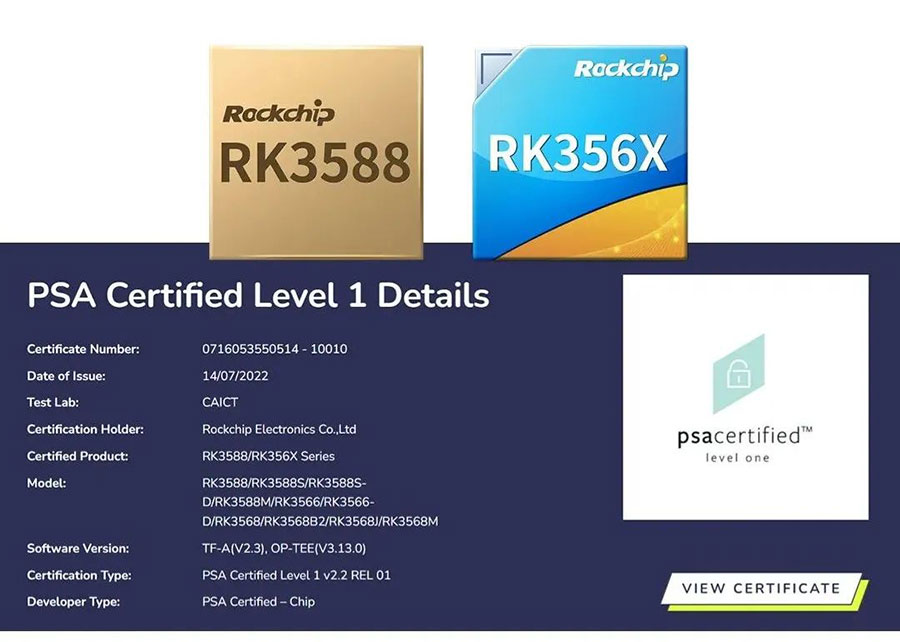 近日,瑞芯微RK3588RK356X系列芯片(包含RK3588/RK3588S/RK3588S-D/RK3588M/RK3566/RK3566-D/RK3568/RK3568B2/RK3568J/RK3568M)正式通過PSA Certified Level 1安全認(rèn)證。