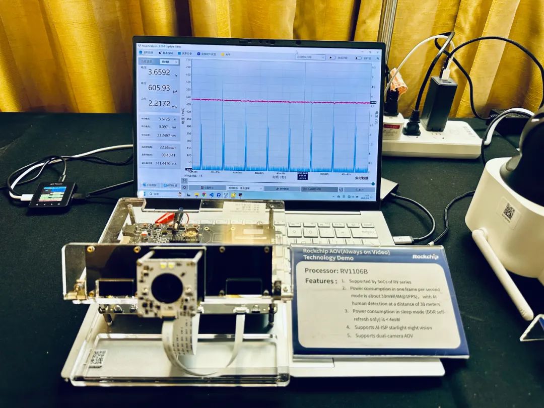 機器視覺展區(qū),展示了基于瑞芯微多款視覺方案的豐富產(chǎn)品形態(tài),包括4K60運動DV、AI智能視覺眼鏡、雙目AOV IPC、雙目可視門鈴、打獵機、醫(yī)用內(nèi)窺鏡等,廣泛應(yīng)用在安防、娛樂、教育辦公、醫(yī)療等場景。展品采用RV1106B系列及RK3576,重點演示了瑞芯微AOV超低功耗及新一代AI-ISP技術(shù),支持一秒一幀或者一秒多幀低幀率全時錄像,極低功耗運行;以及暗夜拍攝效果畫面亮度及色彩還原度效果更好。