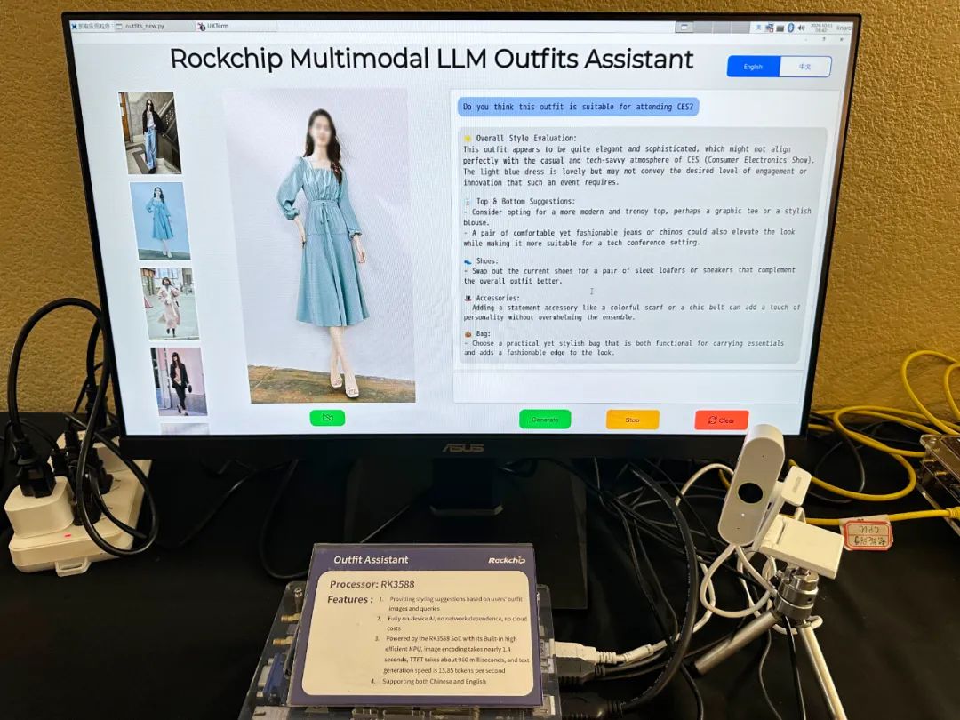AI算法展區(qū)展示的是最新推出的基于RK3588的智能助手及穿衣助理。智能助手利用端側(cè)運行的LLM模型,可以解答各類問詢,提供檢索增強技術(shù)模塊,可以通過添加不同的產(chǎn)品文檔秒變各類產(chǎn)品專家;集成了ASR和TTS算法,讓用戶可以與其進行語音對話;并支持數(shù)字人技術(shù),體驗沉浸式交互。穿衣助理是基于一個本地運行的多模態(tài)大模型,它可以根據(jù)用戶上傳的照片或信息,快速分析用戶的風(fēng)格偏好,并提供多種穿搭組合;響應(yīng)迅速,實時提出建議,可應(yīng)用在智能家居及個人助手智能設(shè)備領(lǐng)域。