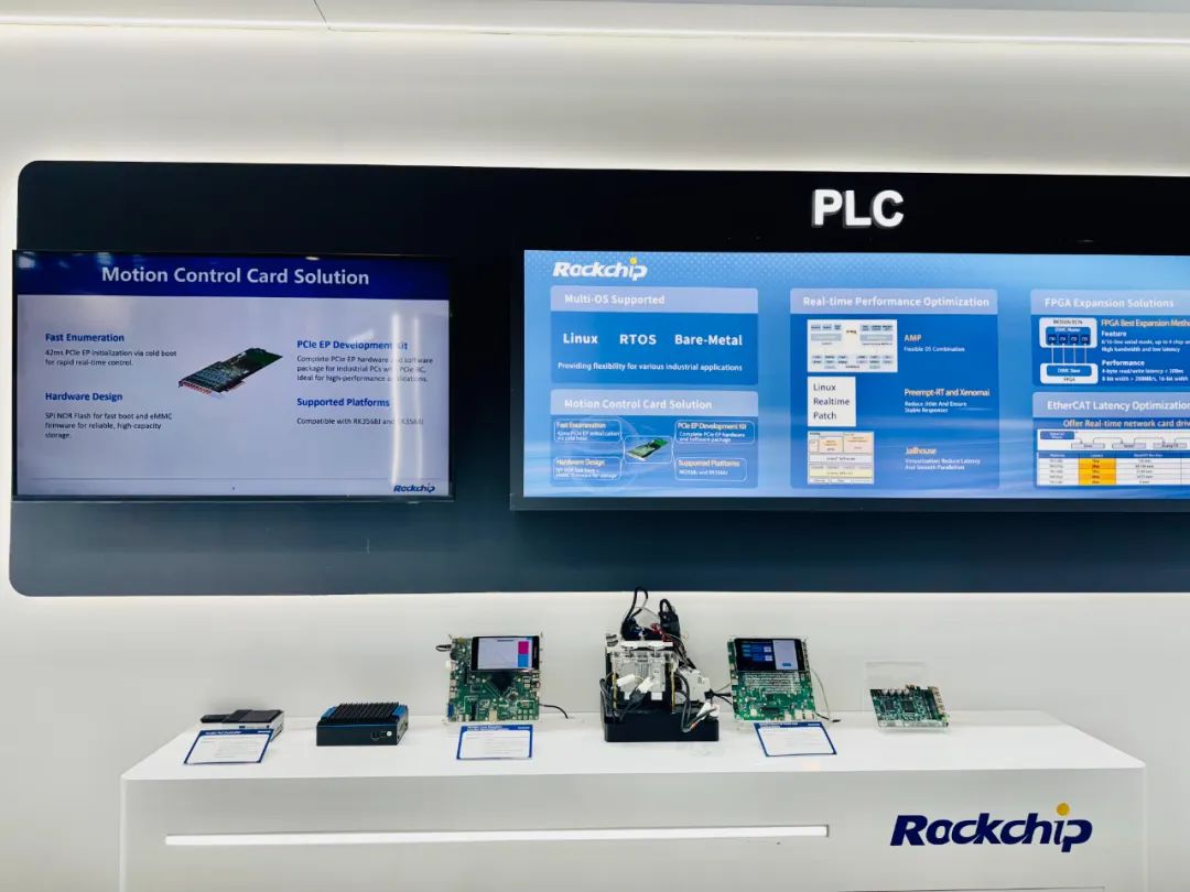 PLC方向,搭載RK3588J、RK3576J、RK3568J、RK3506J的EthercaCAT多軸控制、PCIe EP卡及PLC方案及應(yīng)用展出。基于RK3576J的多軸控制支持IgH EtherCAT協(xié)議,兼容主流工業(yè)設(shè)備如伺服驅(qū)動(dòng)器、I/O模塊,可適配專用網(wǎng)卡驅(qū)動(dòng),實(shí)時(shí)性更強(qiáng);延時(shí)抖動(dòng)性能達(dá)到5%以內(nèi)(周期為1毫秒),在1ms控制周期,可支持64/128軸總線控制,針對(duì)不同類型的運(yùn)動(dòng)控制場(chǎng)景的適用性更強(qiáng),適用于工業(yè)機(jī)器人、物流等應(yīng)用場(chǎng)景的設(shè)備升級(jí)。
