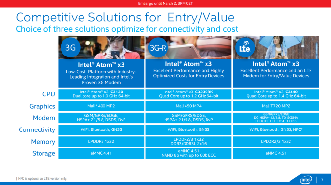 Th ex3 sits at the bottom, and is comprised of Bay Trail based SoCs at the 28nm no deal previously part of the SoFIA program aimed at emerging markets. There will be three x3 parts – a dual core x3, a quad core x3 from the Rockchip agreement, and a final quad core x3 with an integrated LTE modem.