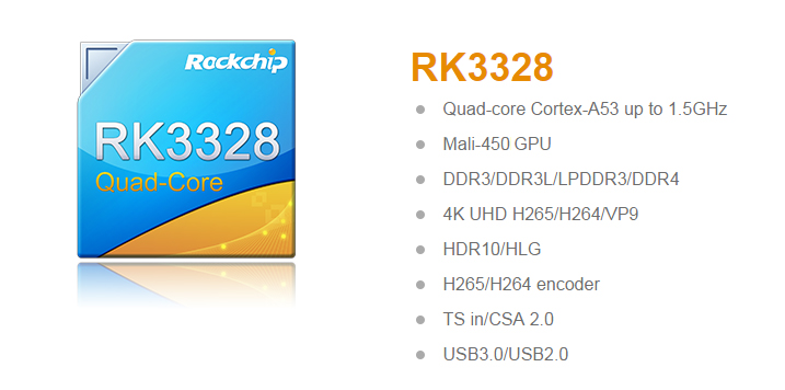 RK3328 UHD TV BOX solution features Quad-core 64-bit Cortex-A53 architecture, up to 1.5GHz, Mali-450 GPU. It supports Android 7.1 and Linux OS, 4K 60fps video decoding, HDR10/HLG and HDR2SDR, and meets the latest Ultra HD premium (UHD) standard.